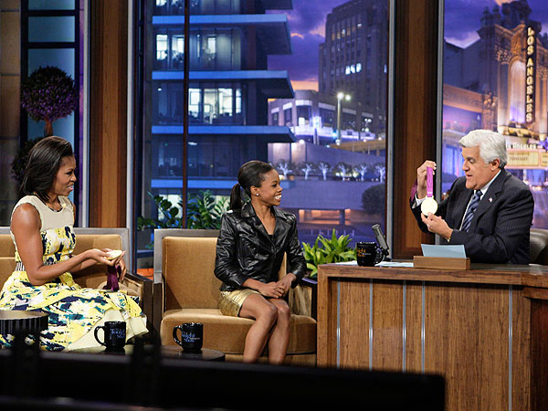 Douglas – who told Leno she “definitely” plans to compete in the 2016 Summer Games in Rio de Janeiro – carried her two gold medals on stage, giving one to Leno and one to fellow guest, Michelle Obama.